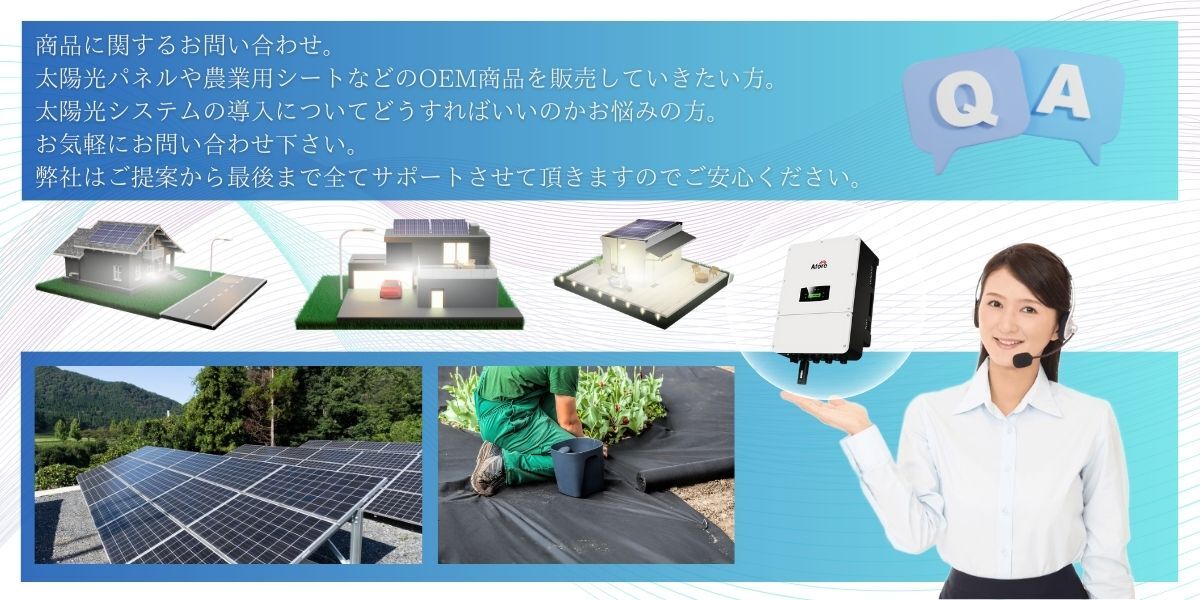 太陽光関連の商品以外にも農業用ドローン、工業用ロボット、移動式住宅などの販売も行っており、太陽光発電に関するO&M(運用管理と保守点検)、太陽光発電のプロジェクトの開発、通信販売などで売る為の商材の輸出入の代行・国際転送なども行っておりますので、何かご相談したい事がございましたら、お気軽にお問い合わせください。