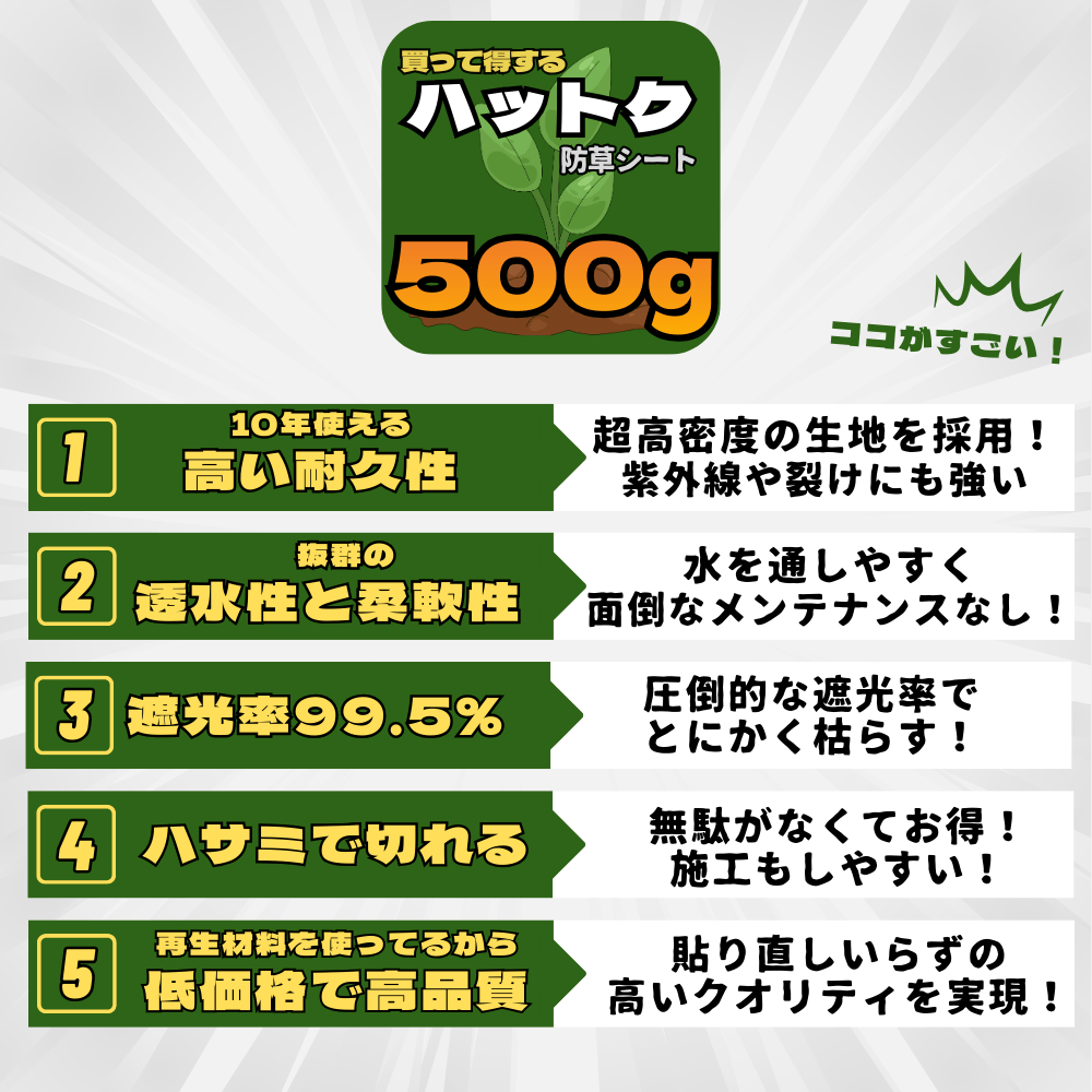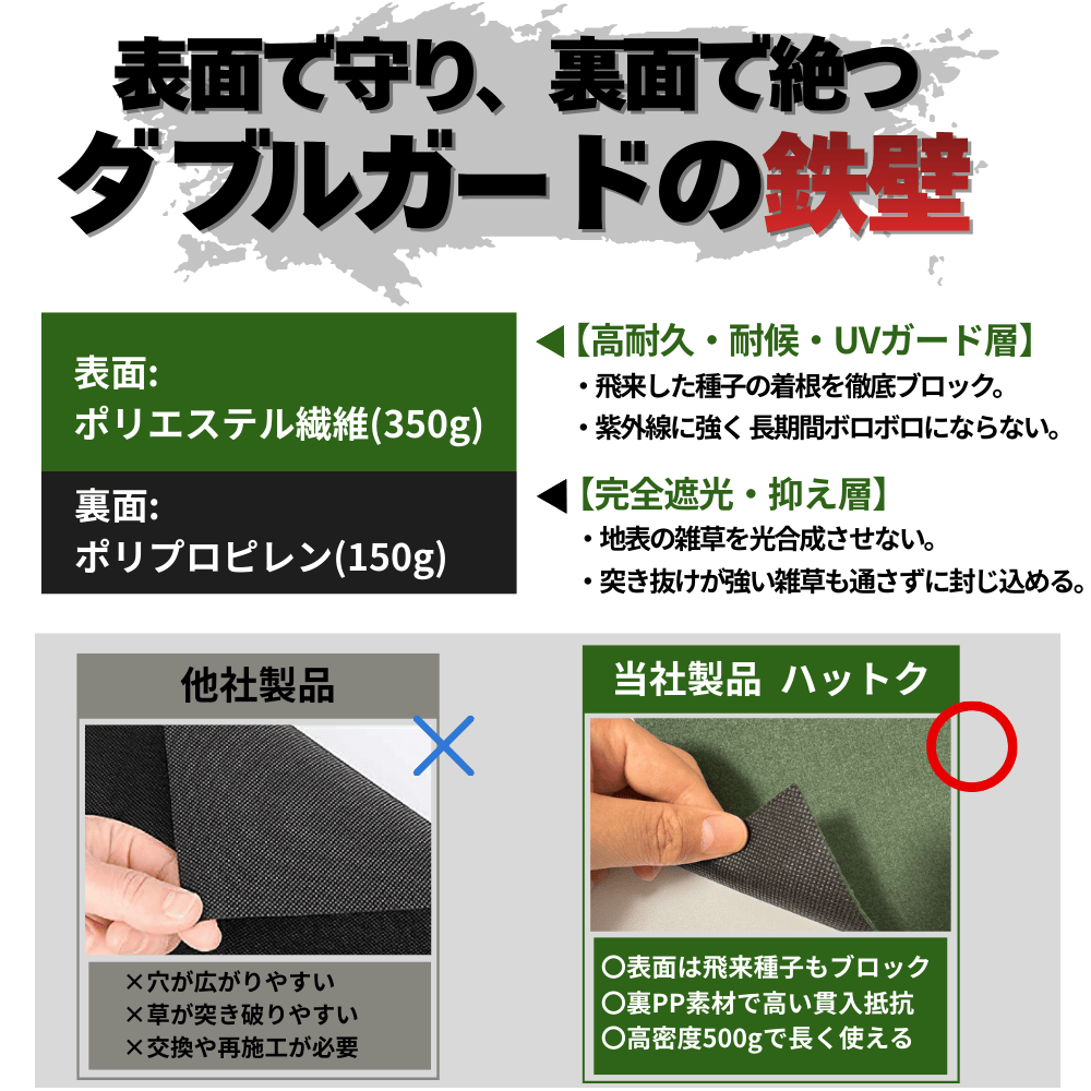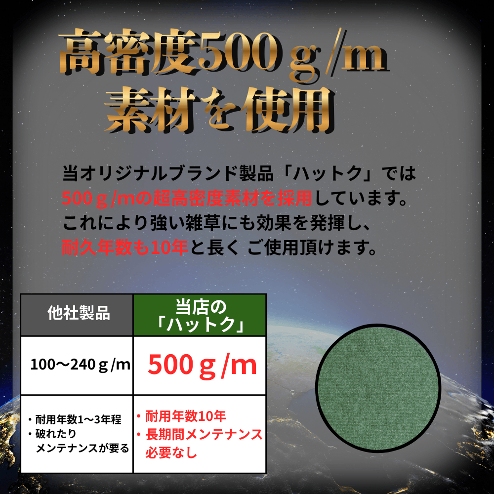 ハットク® 防草シート 幅2m×50m 100平米 裏張り付シート 【350g+150g】500g 高品質100平方メートル 商業用 ソーラーパネル 工事用 [BS-500g-2-50]