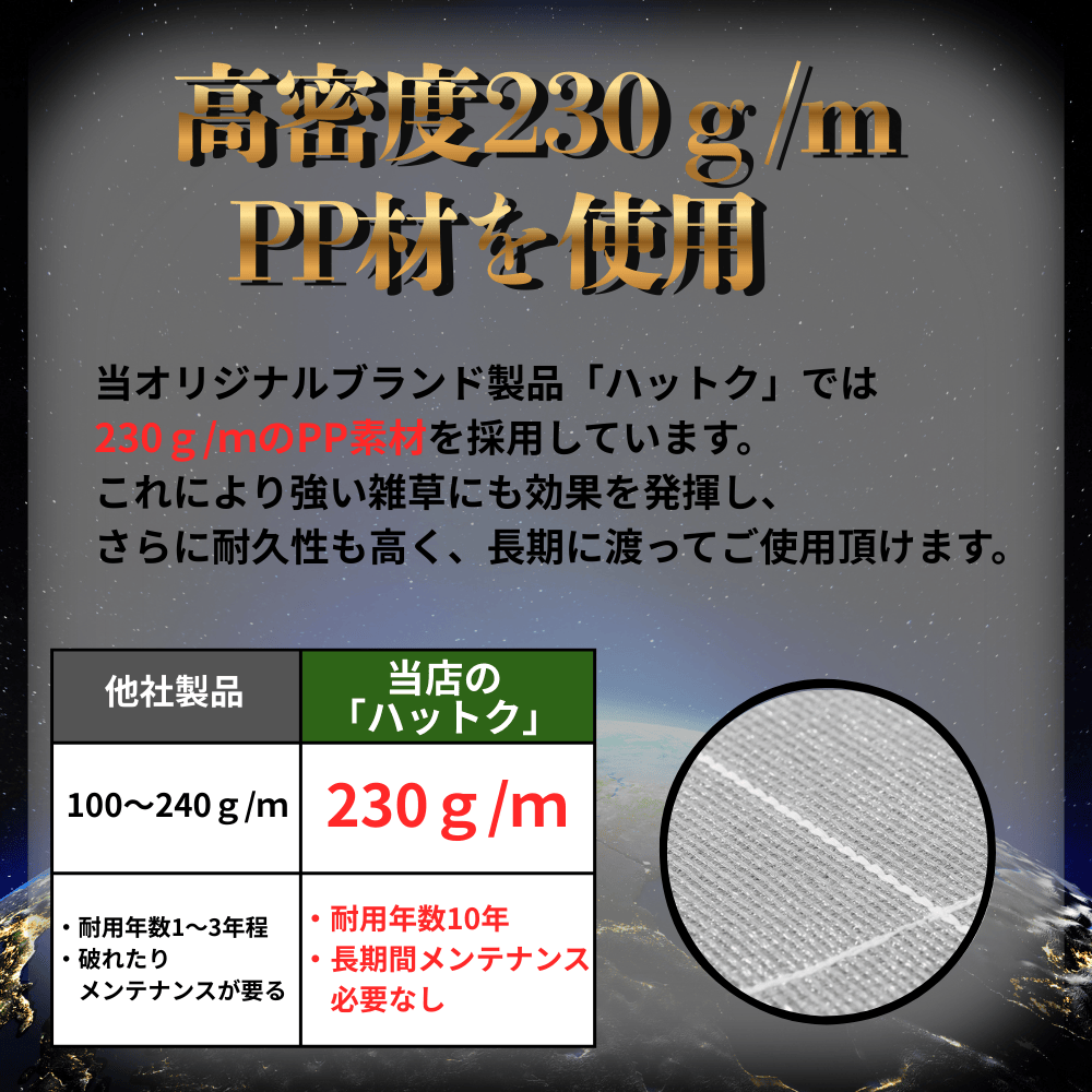 一般的にPP製の防草シートは数年しかもたないとされていますが細かい織り目と高重量で10年耐久を実現した防草シートです。通常販売されている平米重量が100g程度のPP製のシートと比べると密度が全然違います